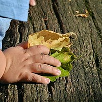 Inklusion Inklusion zum Leihen Inklusionskisten im Bistum Limburg Inklusion+ Erleben Inklusion + Erleben pixabay ein Kinderarm mit einem blauen T-Shirt. Die Hand hat zwei grüne Blätter vom Baum in der